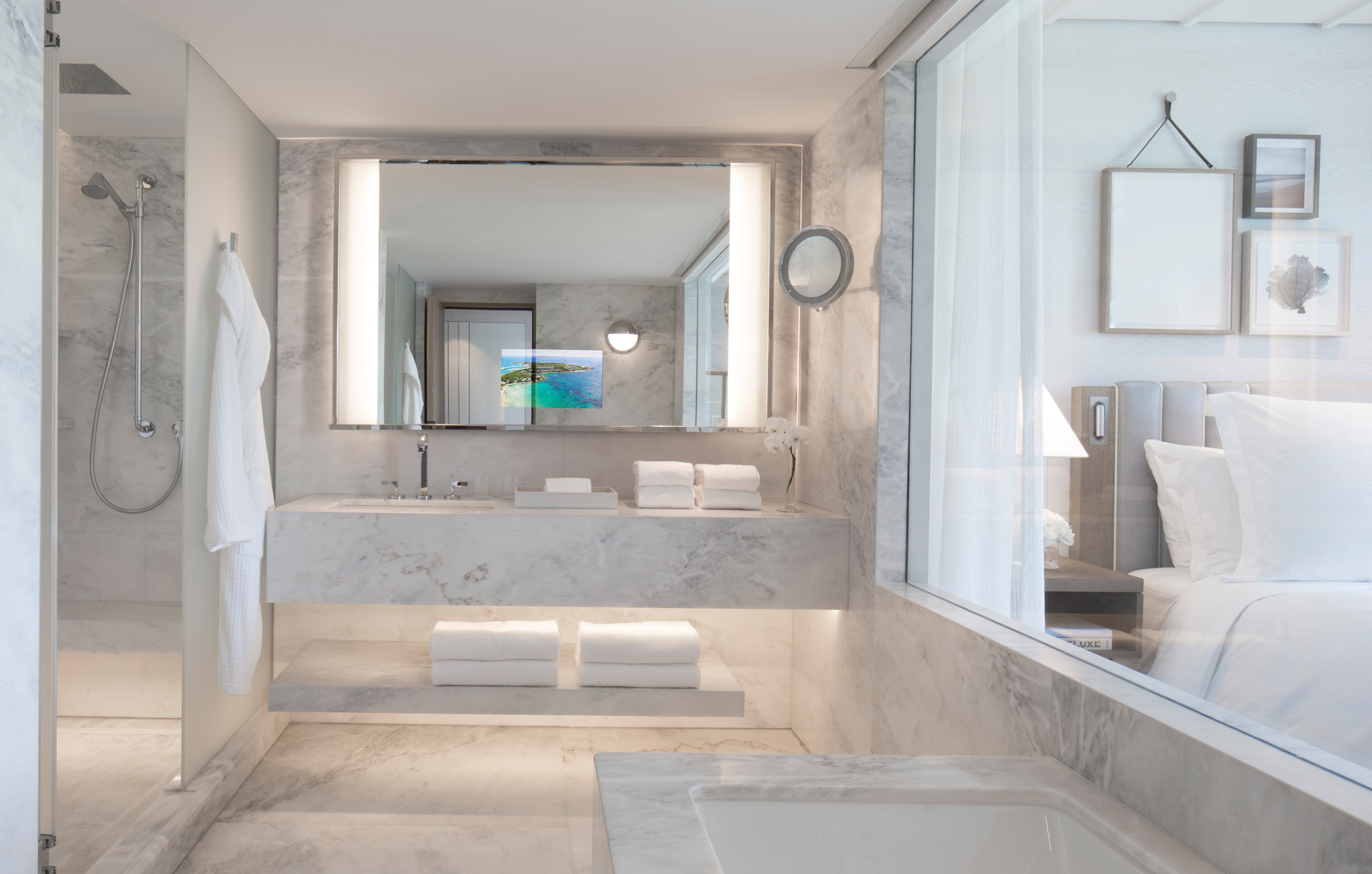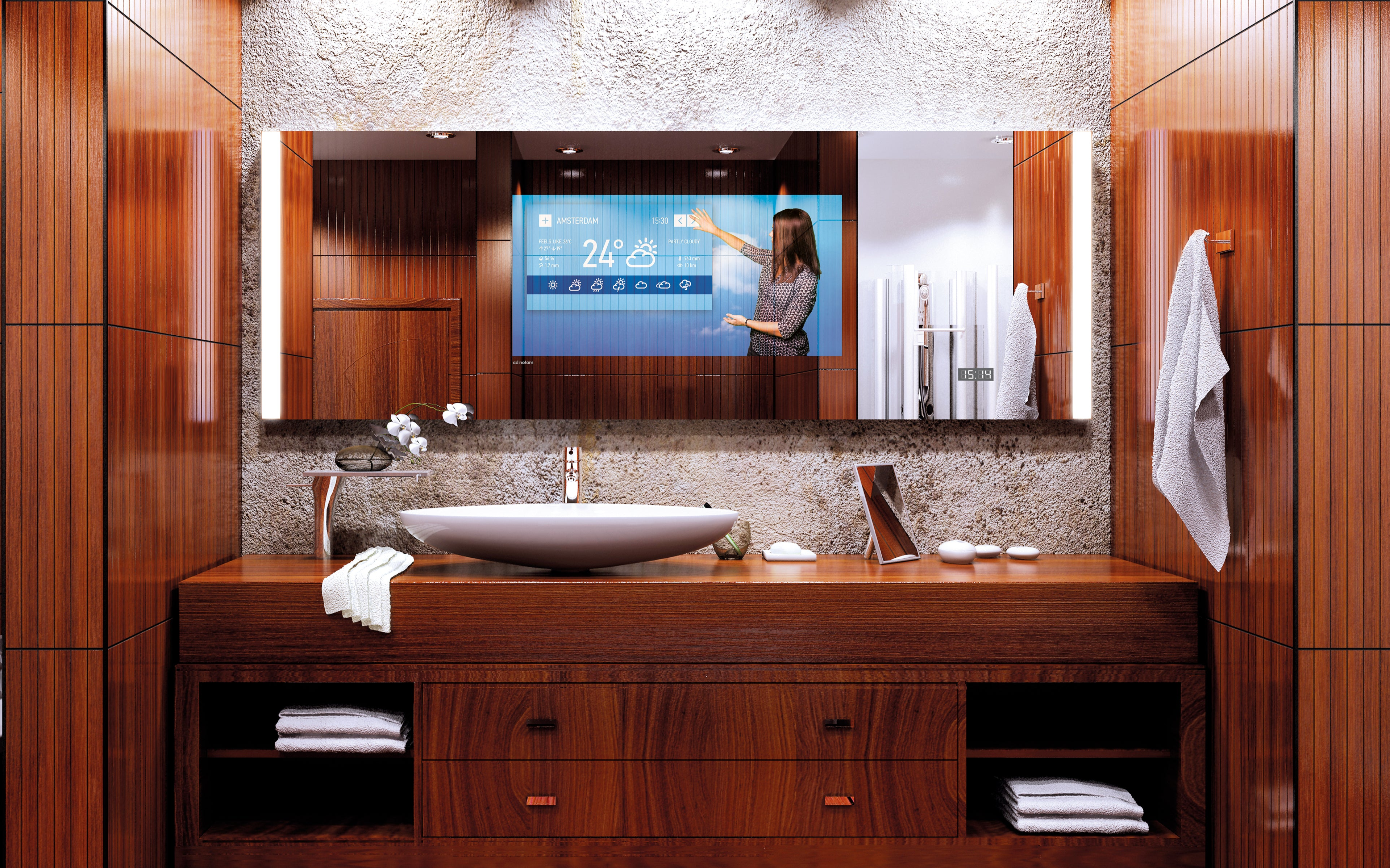 Zu diesem Zweck haben wir einen voll ausgestatteten Badspiegel und einen brandneuen 4K Bildschirm in einem Gerät kombiniert.