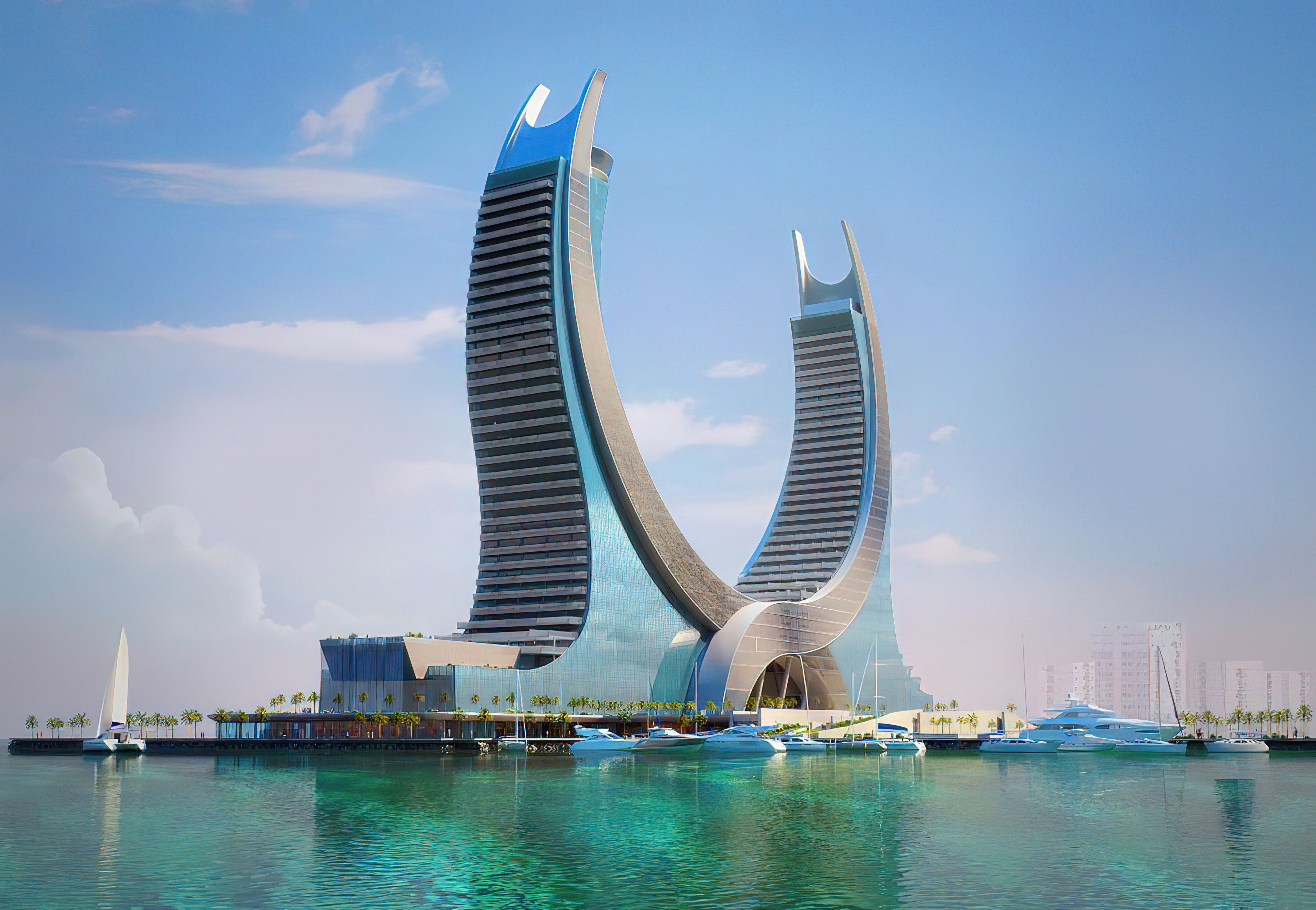 Die sanften Rundungen der Türme, die von den gekreuzten Schwertern des Siegels von Katar inspiriert sind, umfassen mehr als 1.000 Zimmer und Wohneinheiten sowie ein Sechs-Sterne- und ein Fünf-Sterne-Hotel, Markenapartments sowie Büros, Freizeiteinrichtungen und gehobene Einzelhandelsgeschäfte, Verkaufsstellen und Restaurants.