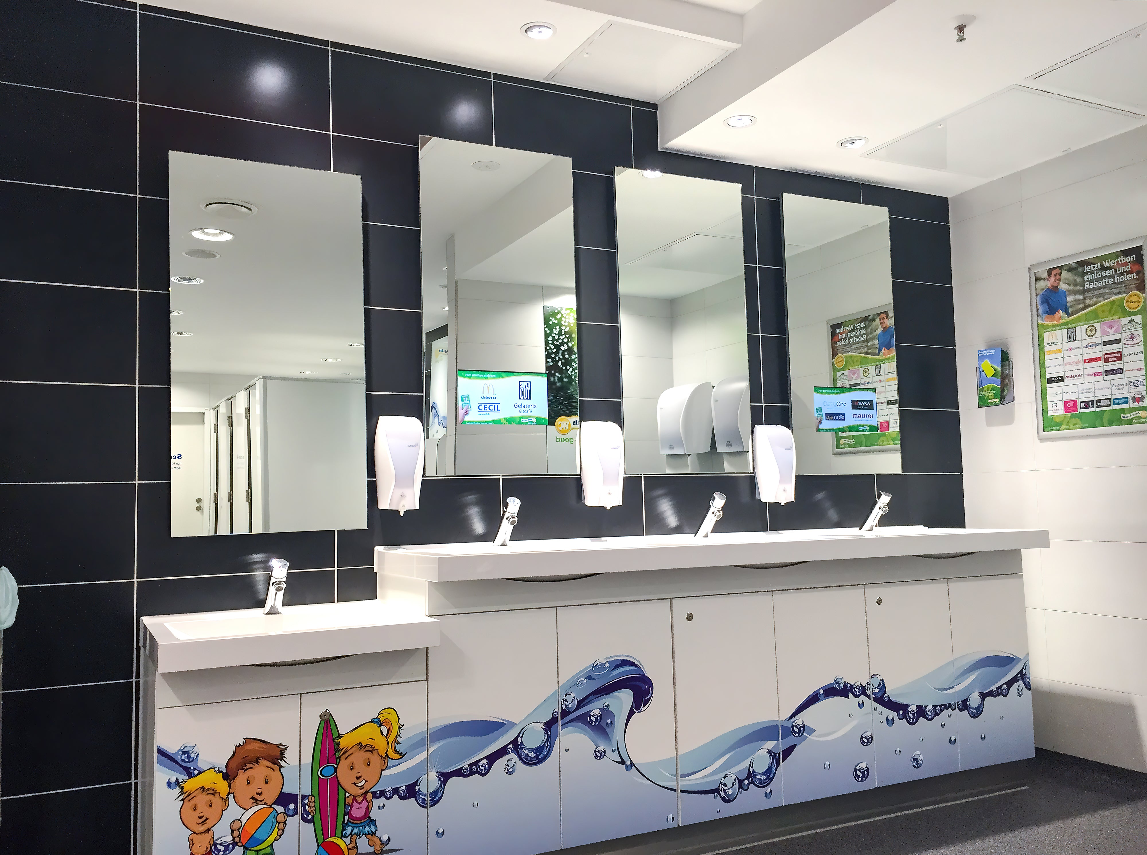 The advertisement can be controlled remotely by our CMS software and is distributed onto a screen area within a mirror from a central server; there is no chance to miss it, and there is no chance you won’t look.